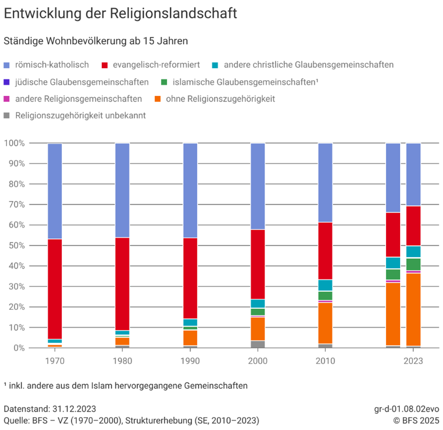 Die Pluralisierung des religiösen Feldes ist nicht auf die Armee beschränkt; sie lässt sich in der gesamten Schweizer Gesellschaft beobachten und ist gut dokumentiert (Stolz et al., 2017), wie die unten stehende Grafik zeigt. Allerdings werden keine Daten zur Religionszugehörigkeit innerhalb der Armee erhoben. Es ist daher unmöglich, ein sozio-religiöses Profil der Armeeangehörigen zu erstellen.